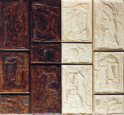 Carton collé sur bois, brou de noix, plâtre sur toile, patine